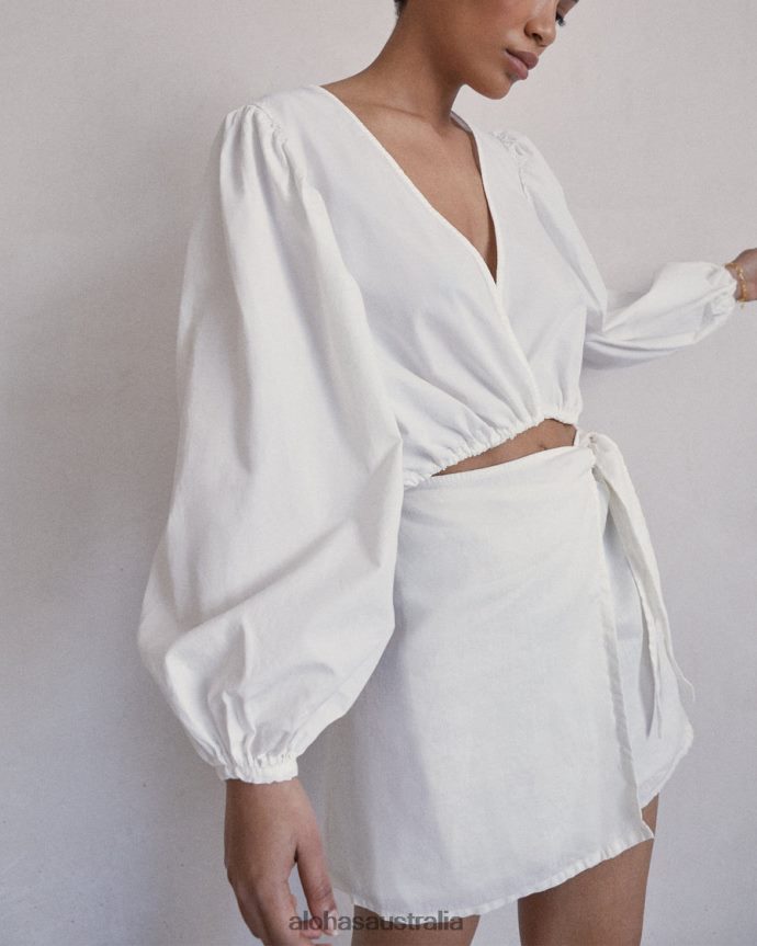 Made from white cotton poplin, the Dazzling top is a warm-weather wonder you will turn to for sunny weekends of socializing. It’s designed in a wrap silhouette with voluminous puff sleeves gathering at the cuffs and a plunging neckline that frames the decolletage. An easy-to-wear blouse that can be dressed up or down – just add the right accessories to make it a summer hit.