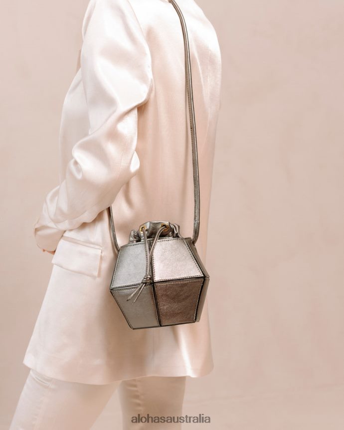 Metallic leather geometric bucket bag with crossbody strap