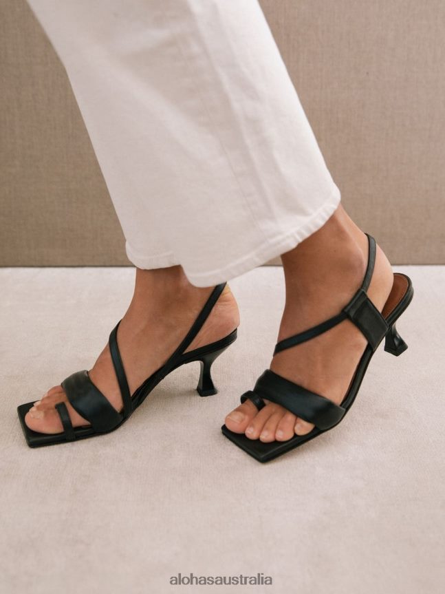 Black leather asymmetric strap sandals with kitten heel