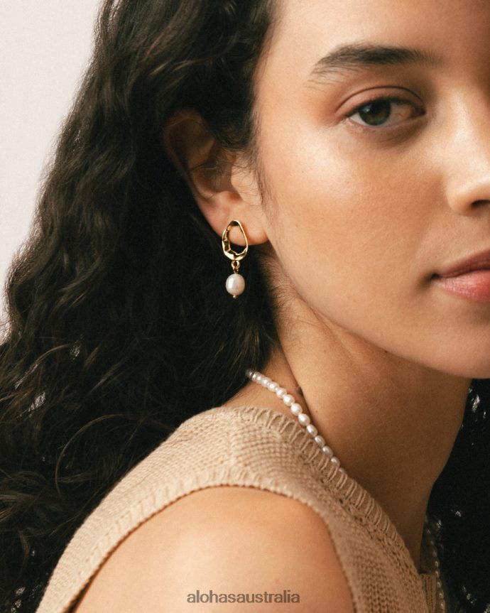 Harnessing the beauty of pearls to bring out your best glow – that’s the Cocoa earrings. This dangling duo is like no other – irregular waves define the sculptural silhouette of the gold studs, while swinging beads suspend from a short drop. Give them their time to shine together with our Simple necklace to match.
