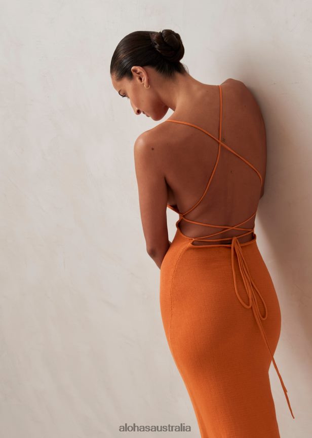 Designed for a close, figure-hugging fit, our Delicate dress delivers on both style and comfort with its vibrant orange hue and soft knit feel. It has a demure high neckline framed by thin spaghetti straps, but surprisingly turns to reveal a sexy open back with adjustable ties. Wear it with chunky gold jewelry and our Bellini sandals to someplace fabulous!