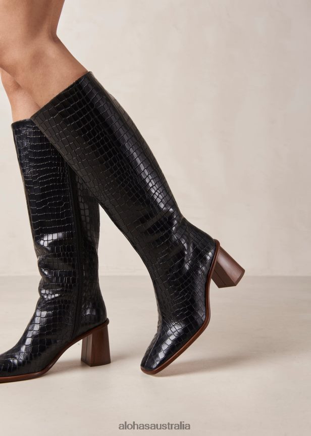 The iconic must-have high knees, now crafted from black croc effect leather. These timeless tall boots feature a squared toe and a side zipper for extra comfort. Their elongated block heel adds flattery and pizzazz to your strut. Expand your footwear rotation with a glamorous pair of East and take on colder days in style.