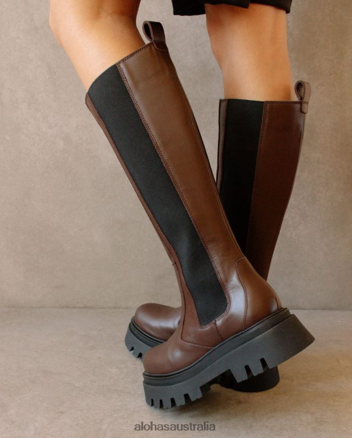 A riding-inspired brown boot for those who love a little sass. Refined in design yet tough enough to ground even your most feminine dress, these knee-highs are made from brown leather with rounded toes and outsized track soles. The elasticated gussets down the side are designed to maximize comfort and easy wear.