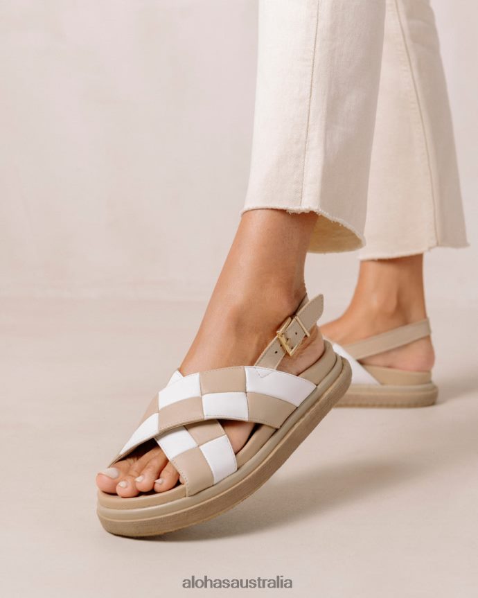 White and beige leather checkered crossover sandals