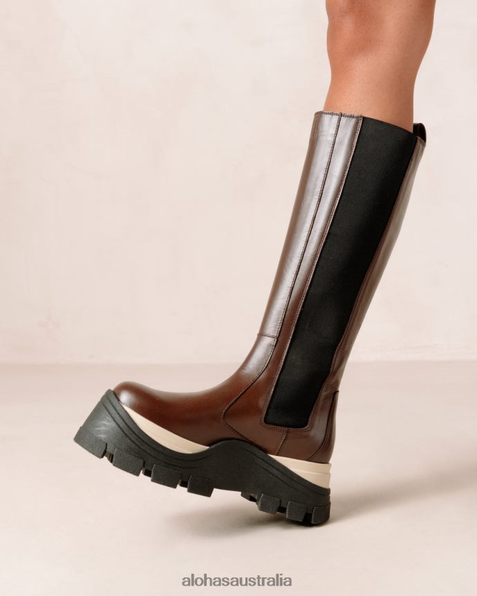Brown leather knee-high boots with platform soles