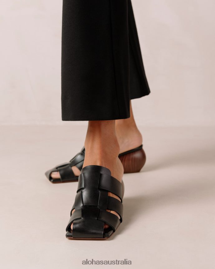 The fisherman sandal, but not as you know it! These black leather mules boast a one-of-a-kind design, featuring basket-woven uppers with a closed toe. Their arty, sculptural wooden heel strikes a balance between wearability and visual interest. Sock up and slip them on to complement your favorite transitional outfit.