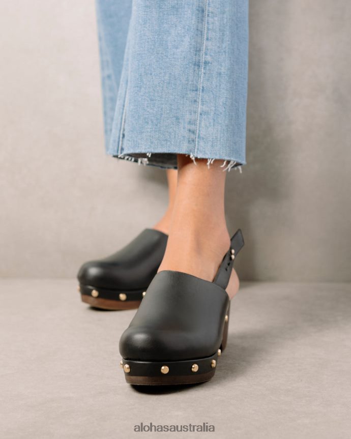 Black leather clogs with wooden heel